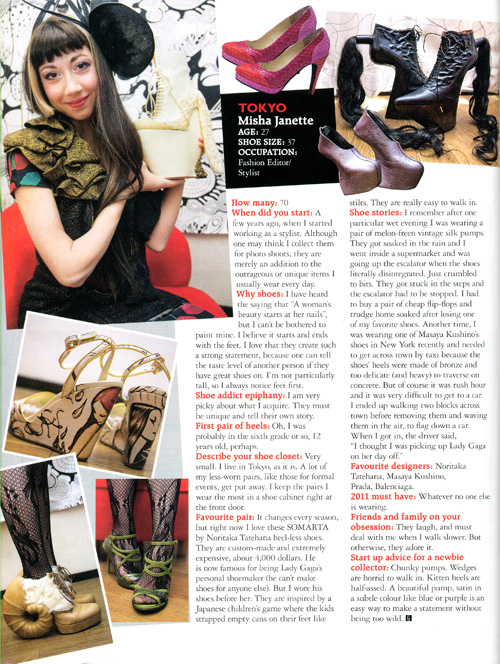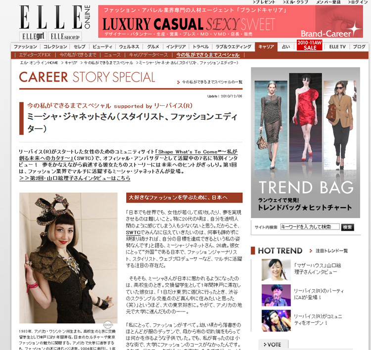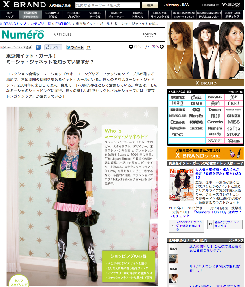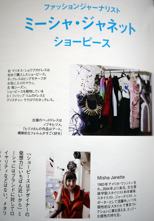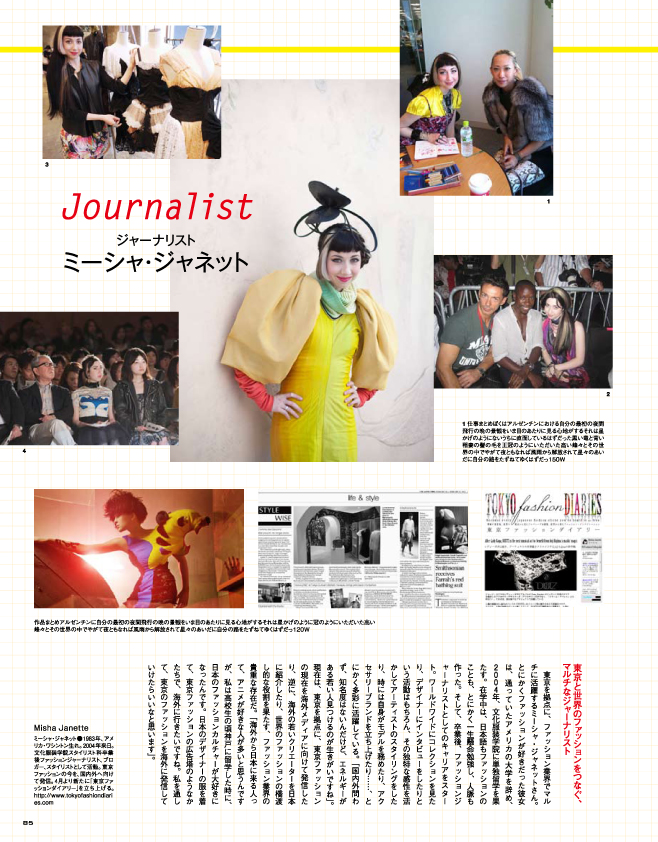 雑誌掲載歴 Misha has been featured in Numero TOKYO, VOGUE girl, SOEN, Mainichi Newspaper, Business of Fashion, Glamour, Company Magazine, Fashion Tsushin, Hong Kong’s I.T Post, Nylon Japan, an-an, ELLE Girl Japan, ELLE online Japan, Elle Italy, Commons&Sense, GINZA Magazine, Guardian UK, Sydney Morning Herald, Cosmopolitan Australia, YOHO China, SELF China, Vision Magazine (CH), KETCHUP (HK), Milk (HK), Grazia India, Japan Fashion Week online, Dazed and Confused’s Satellite Voices and more For a professional portfolio overview, see below or www.mishajanette.com